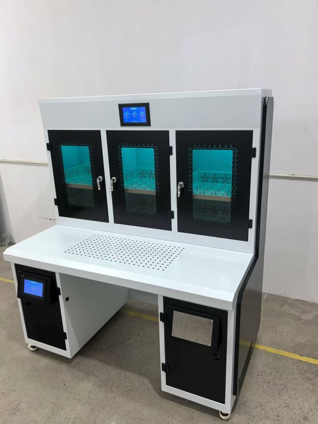 2.整理台安装有感应探头,有人操作时,自动启动除尘功能,人员离开,自动停止。 整理台为三列独立结构,可分别进行档案,产品设计一台7寸触摸屏,可独立控制单个仓室,也可同时控制。并带有定时功能,可分别完成三列的智能化控制操作方便,使用安全。