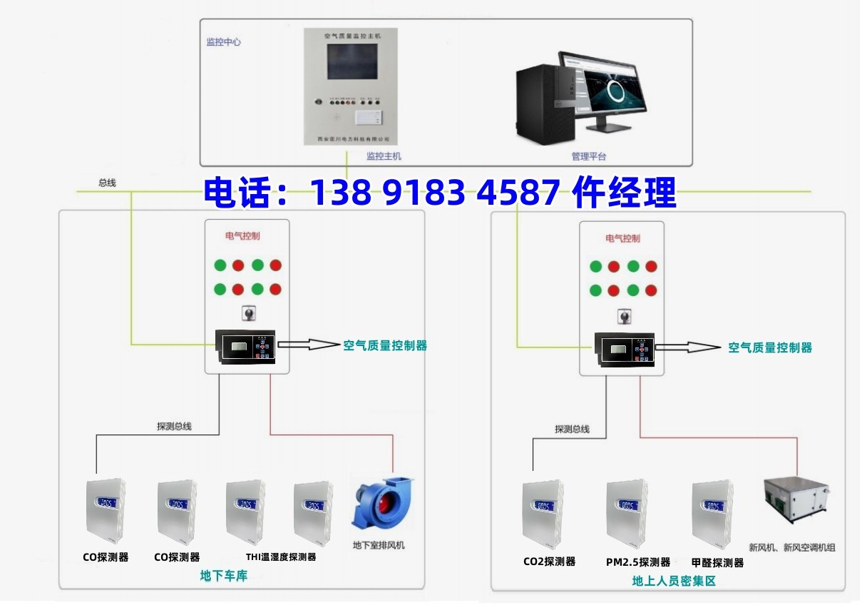 监测地下车库CO浓度,当室内CO浓度>30ppm时,系统自动启动送/排风机确保地下车库空气质量始终满足绿色建筑要求