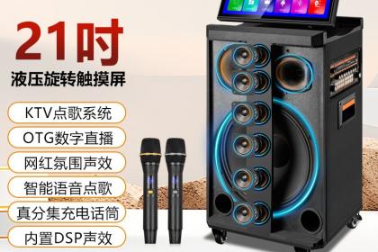 功能特点: KTV/安卓双系统,23寸高清大屏,智能全屏触控、点歌、歌星点歌、遥控点歌,无线WiFi网络连接、DSP声场处理系统、专业网红声卡、多氛围场景、5.0蓝牙、高清输出、USB、TF卡播放、外接12V蓄电池充电