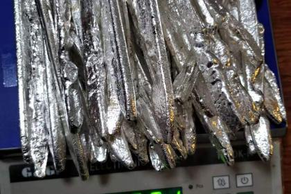废银锌电池含银52.55%、含锌42.7%。锌为负极,氧化银为正极涂在铜网骨架上。物质再生应用研究所采用稀硫酸分手浸锌和铜,银粉间接熔锭。稀硫酸浸铜时参加氧化剂,含锌液经浓缩结晶消费硫酸锌,含铜液浓缩结晶消费硫酸铜。锌回收率>98%,银回收率98%,银锭纯度>99%。